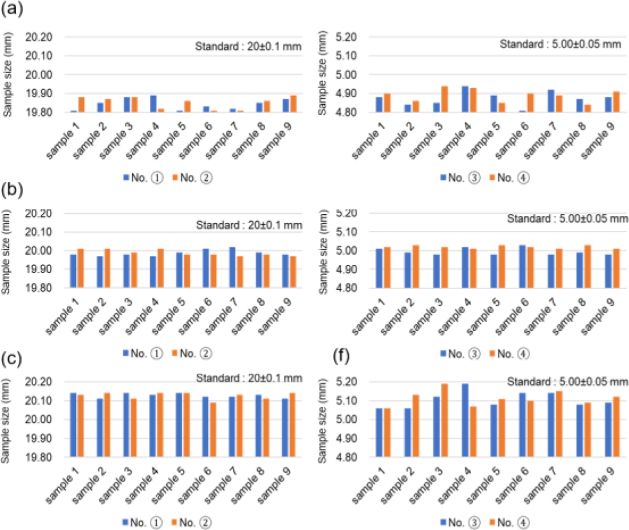 To establish the output conditions for the composite resin containing surface-modified Barium glass powder, the UV exposure time at 405 nm was varied while printing standard square donut specimens. The dimensions of each test specimen were measured to ensure compliance with the specified tolerance grades, as shown in Fig. 11.