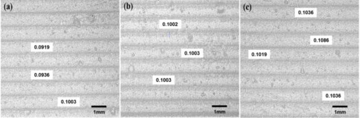 In panel (a), when the exposure time was adjusted to 1.9 s, it was visually confirmed that the specimen adhered to the platform without detaching during the layer curing process. However, the measurements indicated that the size of the cured specimen did not meet the tolerance criteria, resulting in a dimension smaller than the intended size. Panel (b) reflects the results when the exposure time was increased to 2.0 s, demonstrating that both the shape dimensions and tolerance criteria were satisfied. Conversely, in panel (c), increasing the exposure time to 2.1 s led to excessive curing, resulting in a specimen larger than the specified dimensions. Additionally, the layer height was uniformly set to 100 µm under each UV exposure condition, and the measured layer thicknesses are presented in Fig. 12. In panel (a), with a 1.9-second UV exposure, an average layer thickness of 95.2 µm was measured, indicating insufficient exposure time to achieve the full 100 µm layer height. In panel (b), with an exposure of 2.0 s, an average thickness of 100.2 µm was achieved, confirming that the applied layer height during slicing was adequately satisfied. However, in panel (c), with a 2.1-s exposure, the measured thickness averaged 105.4 µm, indicating over-curing. The over-cured layer thickness resulted in subsequent layers being cured at a greater height than intended, potentially leading to a decline in the precision of the final shape.