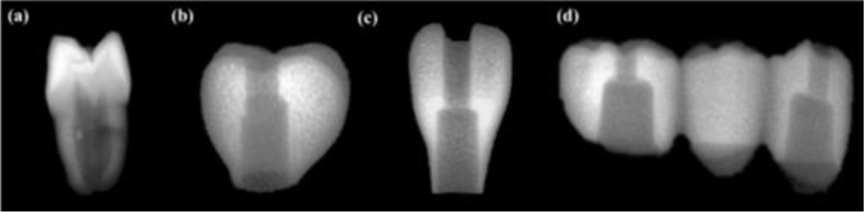 Fig. 14 Radiography of (a) Extracted natural crown, (b) 3D printed artificial second molar crown, (c) 3D printed artificial lateral incisor crown, (d) 3D printed 3-unit bridge |