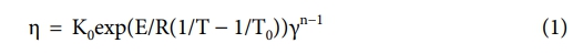 여기서 η는 점도(Pa·s), K0는 점도 계수(Pa·s), E는 활성화 에너지(J/mol), R은 기체 상수(J/mol·K), T는 절대 온도(K), T0는 기준 온도(K), γ는 전단속도(1/s), n은 유동 지수를 나타낸다.