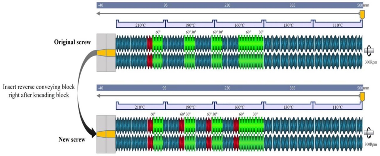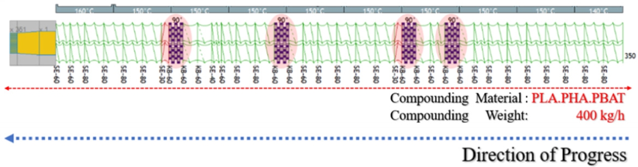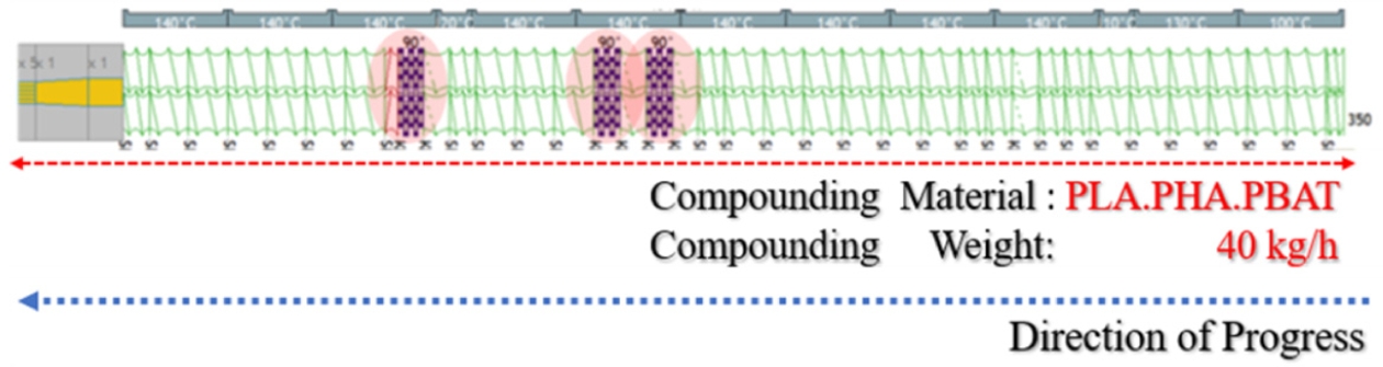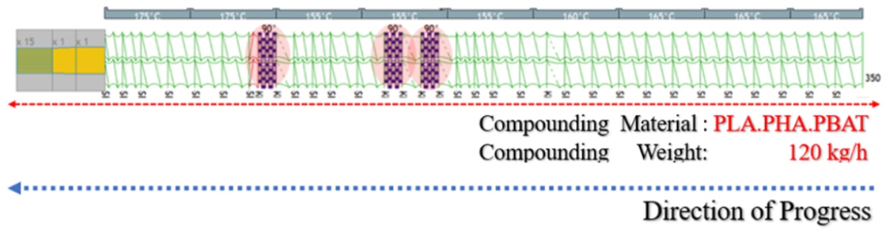 Twin-Screw Extruder (TSE)는 생분해성 고분자 및 복합소재의 혼련과 분산 공정에서 핵심적인 역할을 수행하는 장비로, 스크류 직경, 회전수, 스크류 프로파일, 혼련 블록의 설계 등 다양한 공정 변수에 따라 최종 소재의 품질이 결정된다[3]. 특히 TSE의 혼련 요소 설계와 프로파일 최적화는 공정 중 전단속도, 체류시간 분포, SME (Specific Mechanical Energy) 등에 직접적으로 영향을 미치며, 이를 적절히 최적화하지 않으면 스케일업 과정에서 균일한 물성을 확보하기 어렵다.