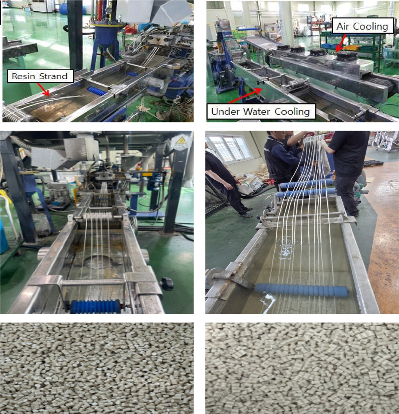 파일럿 스케일 압출공정은 32 mm 스크류 시뮬레이션 조건을 기반으로 48 mm 직경 및 L/D 비 40 이상의 트윈 스크류 압출기(TSE)로 스케일업하여 수행되었으며, 시뮬레이션과 동일한 조건에서 운전되었다. 본 공정은 32 mm → 48 mm 스케일업 조건을 반영하여 설계되었다. 투입 소재는 PLA 70%와 PHA/PBAT 30%의 혼합물로 구성되었으며, 스크류 회전수는 200–400 rpm, 토출량은 60–120 kg/h 범위에서 설정되었다. 공정 설계는 시뮬레이션 분석 결과와 파일럿 생산 데이터를 정량적으로 비교하여 최적 조건을 도출하고, 실제 공정 데이터와 시뮬레이션 결과 간의 정밀한 상관성을 평가하였다. 32 mm에서 48 mm 직경으로의 스케일업 공정 및 장비 전환 과정은 Fig. 6에 나타난 바와 같다.