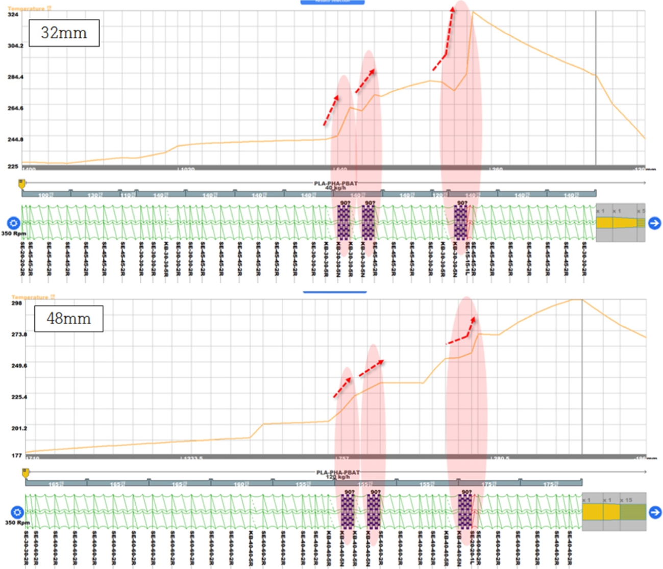 Fig. 7 Comparison of Temperature Profiles between 32 mm(Top) and 48 mm(Bottom) Screws |