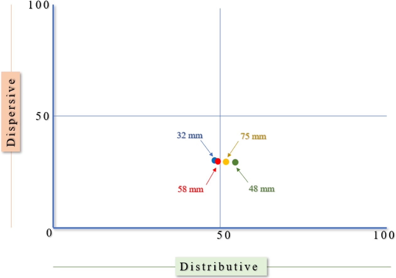 Fig. 8 Comparison of Dispersive and Distributive Mixing Efficiency for Various Screw Diameters |