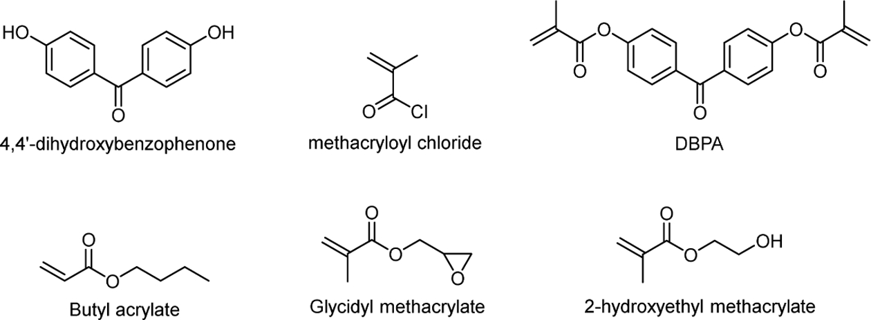 Monomer 합성에 사용된 4,4’-Dihydroxybenzophenone은 Tokyo chemical Industry(Japan)에서 구입하였으며, Methacryloyl Chloride 및 Triethylene amine은 Sigma-Aldrich를 통해서 구입하여 사용하였다. Monomer로 사용된 Butyl acrylate(BA), Glycidyl methacrylate(GMA)는 DAEJUNG(KOREA)에서 구입하였으며, 2-hydroxyethyl methacrylate(HEMA)는 SAMCHUN (KOREA)에서 구입하여 사용하였다. 합성한 Monomer를 포함하여 사용된 Monomer들의 화학구조는 Fig. 1에 나타내었다. 고분자 중합의 개시제로 사용된 benzoyl peroxide는 Alfa aesar를 통해 구입하여 사용하였다.