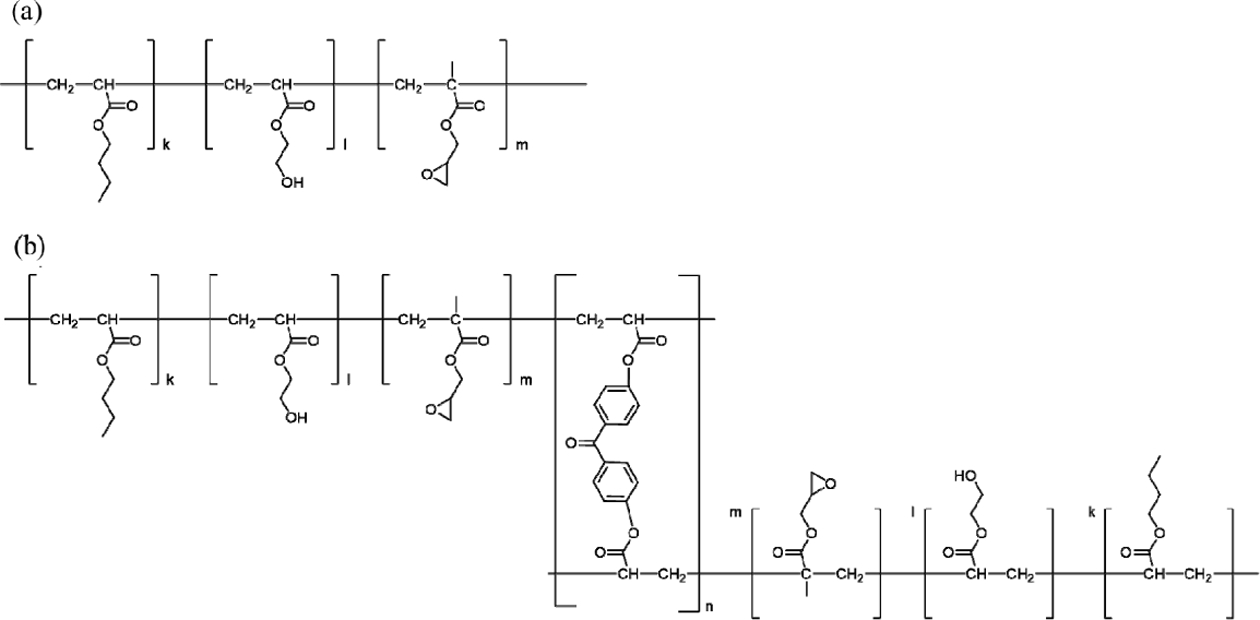 2구 플라스에 단량체들(BA, GMA, HEMA, DBPA)를 Table 1과 같은 조성비로 투입하였다. 이후 개시제(benzoyl peroxide) 0.1 g 및 반응 용매(etheyl acetate) 100 mL를 투입하였다. 이후 반응기에 있는 산소를 제거하기 위해 질소를 주입하며 상온에서 magnetic stirrer를 이용하여 300 rpm의 속도로 30분동안 교반하였다. 이후 혼합액을 질소 분위기하에서 70-75oC를 유지하며 8시간동안 반응을 진행하였다. 생성된 고분자의 구조는 Fig. 2에 나타내었다.