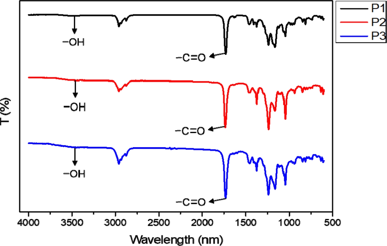 합성된 중합체의 FT-IR spectrum을 Fig. 3에 나타내었다. FT-IR 스펙트럼 분석 결과, 모든 시료에서 3500–3000 cm-1 부근의 O-H 피크와 1730 cm-1 부근에서 C=O 피크가 확인되었다. 또한 1630 cm-1 부근의 이중결합(C=C) 피크가 확인되지 않아, 단량체의 완전 중합이 이루어졌음을 확인하였다.