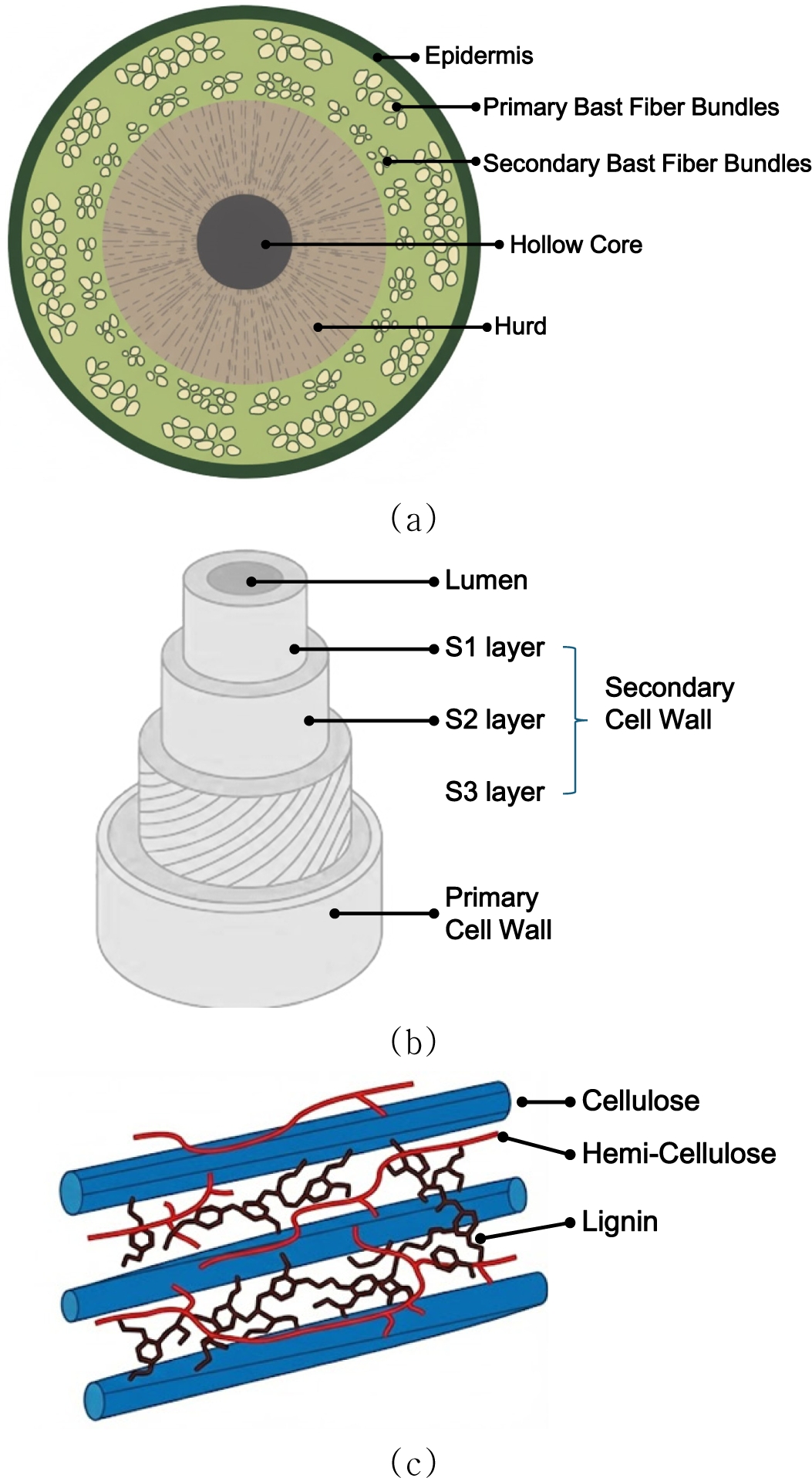 Fig. 1 Hierarchical representation of hemp stems; (a) cross-section model of hemp stem, (b) elementary hemp fiber structure, (c) section of primary cell wall composition |
