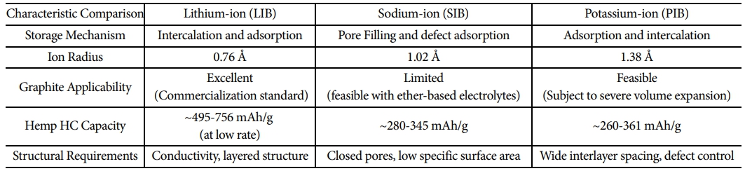 대마 유래 하드 카본(Hard carbon)은 리튬 이온 배터리나 나트륨 및 칼륨 이온 배터리와 같은 차세대 배터리의 흑연 음극이 가진 구조적 한계를 극복할 수 있는 대안으로 고려되고 있다.