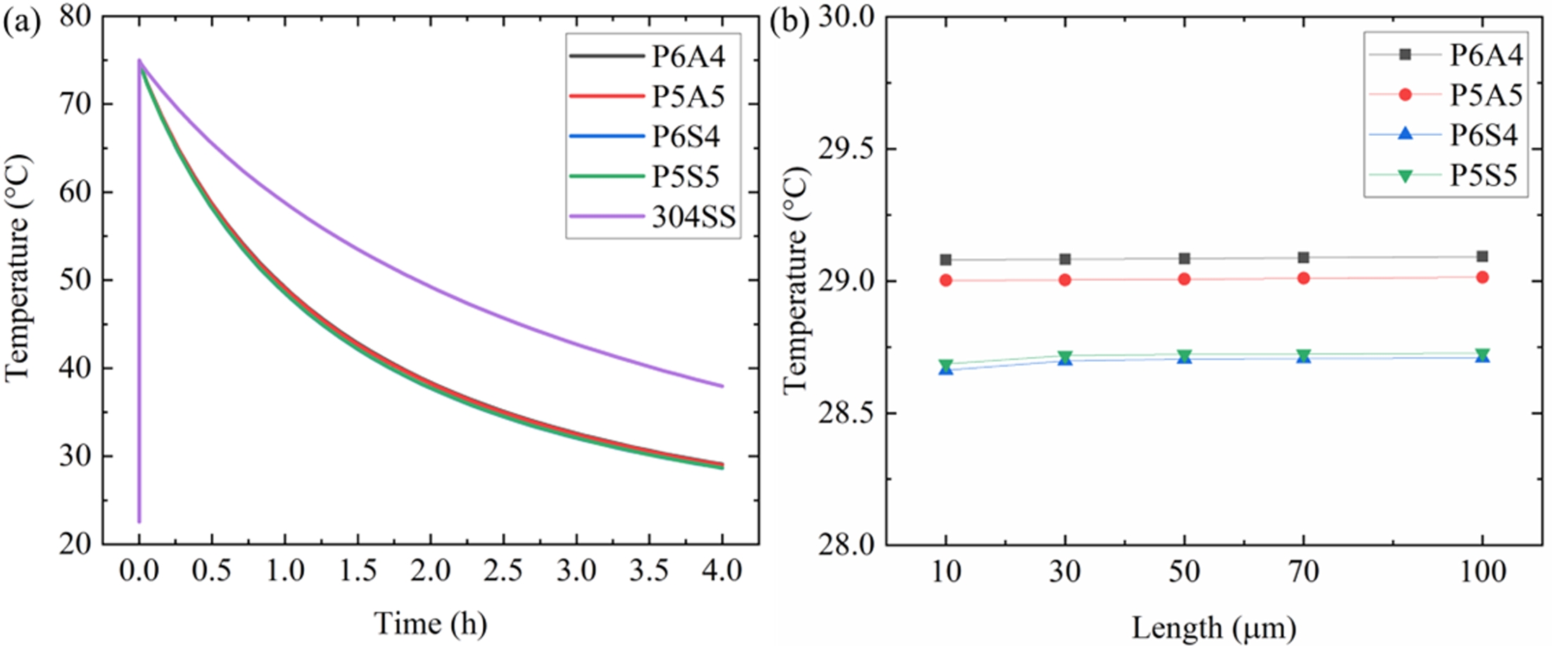 Fig. 2a shows the typical temperature evolution of the outer surface of the 304SS column during cooling, with and without 10 µm-thick ceramic particle–containing coatings. The bare 304SS column reaches 37.9 °C after 4 h of cooling. In contrast, the presence of a coating results in faster cooling. The difference in surface temperature among the columns with various coatings was less than 0.5 °C after 4 h of cooling. P6S4 exhibited the highest cooling rate, followed by P5S5. The surface temperatures of the columns coated with Al2O3 (P6A4 and P5A5) decreased more slowly than those coated with SiC. The cooling curves of P6S4 and P5S5 were almost identical. The final temperatures of P6A4, P5A5, P6S4, and P5S5 were 29.1, 29.0, 28.6, and 28.7 °C, respectively.