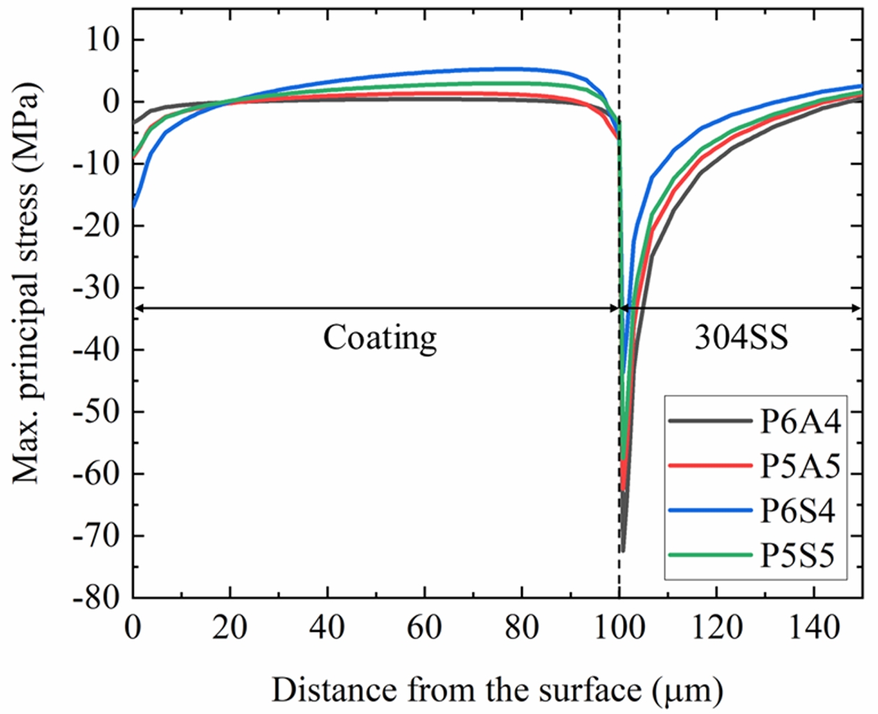 Fig. 3 Profiles of maximum principal stress at the bottom of the column from the surface of coatings with a thickness of 100 μm to 304SS. |