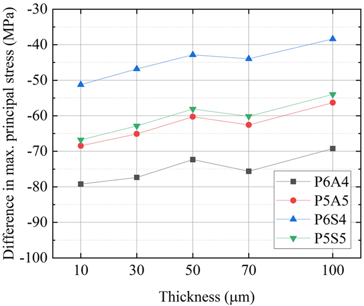 Fig. 4 Difference in maximum principal stress between the coatings and 304SS. |