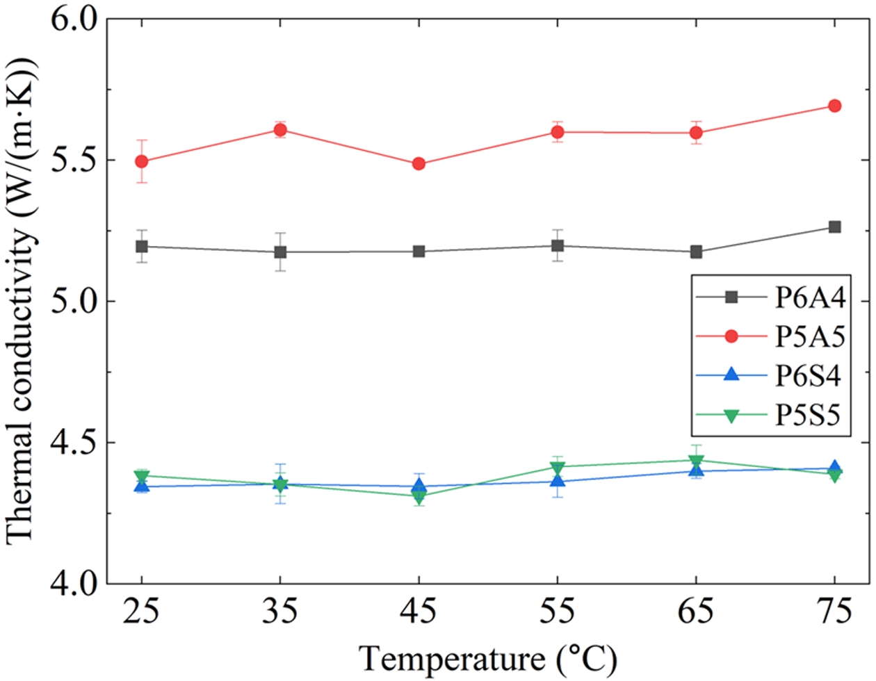 To validate the numerical results, experimental measurements of thermal conductivity were conducted on 304SS plates coated with different ceramic particles, as shown in Fig. 5 as a function of temperature. The thermal conductivities of P6A4 and P6S4 were higher than the estimated values (Table 2), which can be attributed to the presence of the 304SS substrate, whose thermal conductivity is approximately three times higher. For P5A5 and P5S5, the measured thermal conductivities were lower than the predicted values. The lack of continuous conductive pathways due to particle–matrix debonding and coating delamination from the substrate can account for the low thermal conductivity [13]. No significant change in thermal conductivity was observed with increasing temperature.