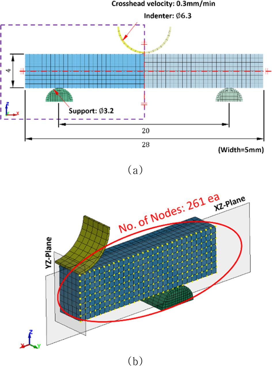 본 Hybrid PINN 학습을 위한 FEA 참조 데이터를 구축하기 위해 단보 전단 시험이 ANSYS/LS-DYNA의 implicit method로 수행되었다. 해석을 위한 모델 형상은 1/4만 고려되었으며, 시편에는 UD CFRP 물성인 Table 1이 MAT54/55 Enhanced Composite Damage을 통해 적용되었다. Fig. 1(a)와 같이 시편의 요소는 0.5 mm 크기의 Hexahedral element이며, 총 1,120개 요소로 이루어졌다. ASTM D2344/D2344M[3] 규격에 따라 indenter와 support의 반지름은 각각 Ø6.3 mm, Ø3.2 mm이고, Span은 20 mm이며, 압입 속력은 0.3 mm/min FEA가 수행되었다.