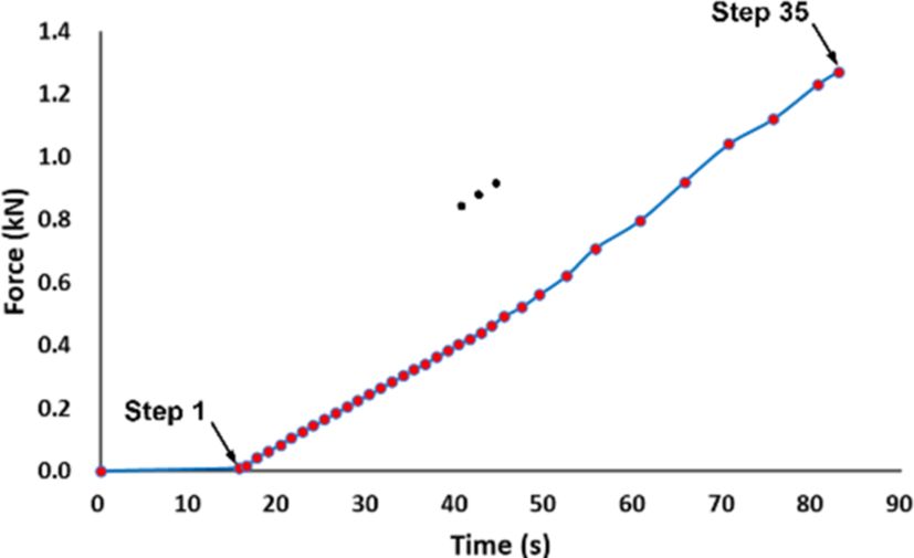 FEA로 구현된 단보 전단 시험은 시편의 탄성 구간내에서 압입되는 총 35개의 타임스텝으로 구성되며, Fig. 1(b)에서와 같이 대칭면인 XZ면에 존재하는 총 261개의 node에서 각 타임스텝에 따른 각 node의 좌표가 추출되었다. 추출된 node 좌표는 Fig. 2에서와 같이 indenter에서 도출된 하중과 매칭되어 Hybrid PINN 학습에 적용되었다.
