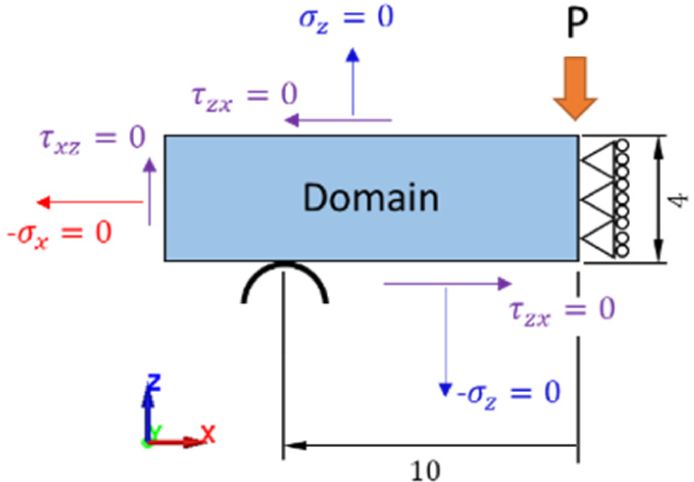 여기서 LSym은 시편 중앙에서의 대칭 거동을 의미하며, Ns는 대칭 경계 영역에 배치된 collocation point 개수를 나타낸다. LCont는 indenter와 support에 의한 접촉 경계조건을 의미하며, Nc는 접촉 경계 영역에 배치된 collocation point 개수를 의미한다. σz'은 Hybrid PINN이 예측한 접촉 응력을 의미하고, LCont은 식 (6)에서 정의된 이방성 헤르츠 접촉 이론에 따른 목표 응력(σz) 분포와의 차이가 최소가 되도록 한다. LFree는 하중이 작용하지 않는 표면에서의 응력 자유조건을 나타내며, Nf는 자유 경계 영역에 배치된 collocation point 개수를 나타낸다.σn은 수직 응력, τnt는 접선 방향으로 작용하는 응력을 의미한다.