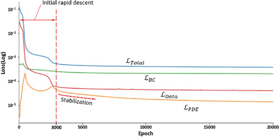 제안된 Hybrid PINN의 학습 과정에 따른 손실 함수의 수렴 거동은 Fig. 4와 같다. 전체 학습 구간은 손실 함수의 감소 경향에 따라 크게 초기 급감 구간과 안정화 구간으로 구분될 수 있다.