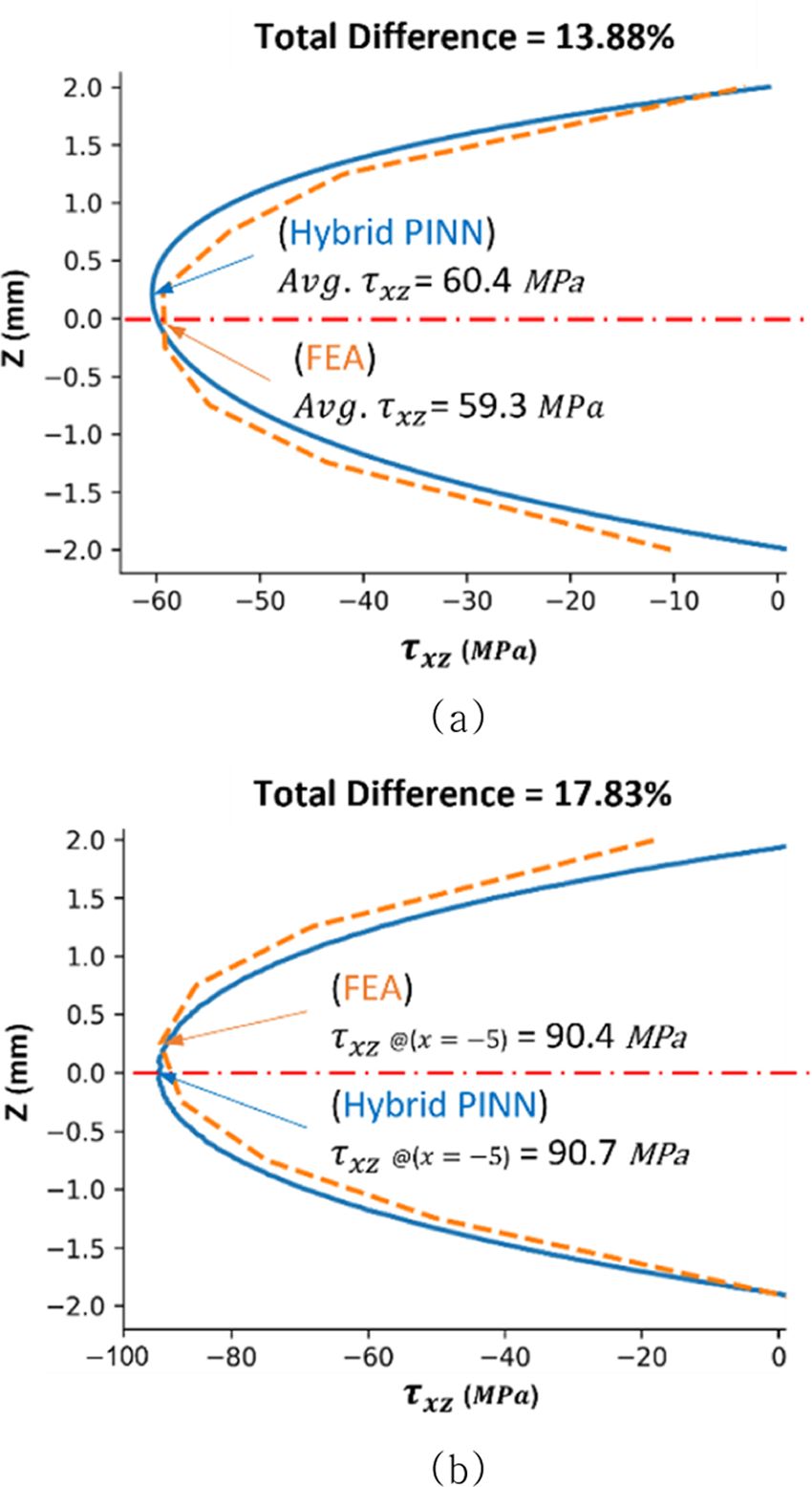 Fig. 5 Qualitative comparison of interlaminar shear stress at the max load: (a) τxz in FEA, (b) τxz in Hybrid PINN |