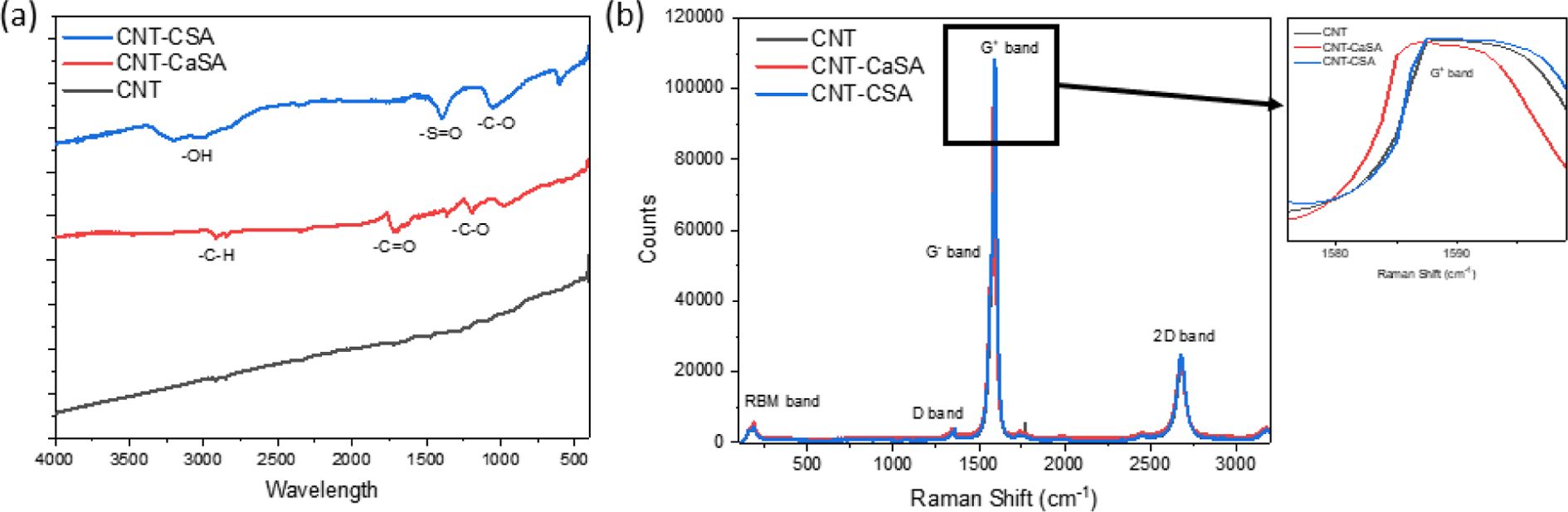 To investigate chemical modifications induced by acid doping in SWCNT films, FTIR and Raman spectroscopy were employed to assess changes in the physicochemical properties of the carbon surface. The FTIR results indicate that acid doping leads to functionalization of the SWCNT surface. Specifically, CaSA introduces carbonyl-related functional groups, while CSA introduces sulfonate groups onto the SWCNT framework (Fig. 4a).