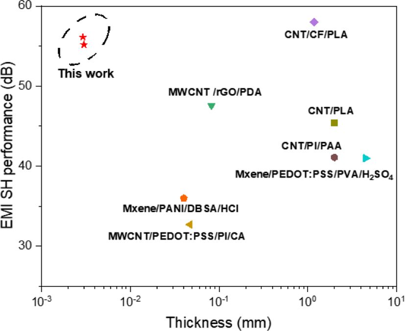 Next, we compare the EMI SH performance of our work with the reported material that was doped using acid (Fig. 6) [19-25]. Importantly, compared to other material our material exhibits exceptional EMI SH performance with a thinner film