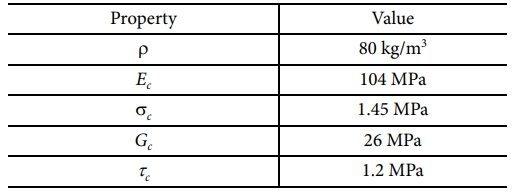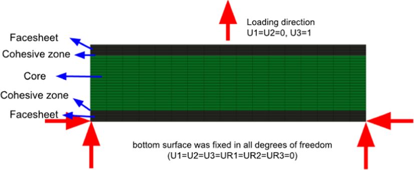 In terms of boundary conditions, the bottom surface of the lower face sheet was rigidly fixed, while a prescribed displacement was applied to the top surface of the upper face sheet to replicate the experimental loading condition. Both the face sheets and the core were discretized using eight-node reduced-integration solid elements (C3D8R), whereas the interface region was modeled with three-dimensional cohesive elements. The complete finite element model consisted of 8,092 elements in total. Detailed material properties employed in the simulations are summarized in Tables 2–4, and the applied boundary and loading conditions are schematically illustrated in Fig. 1.