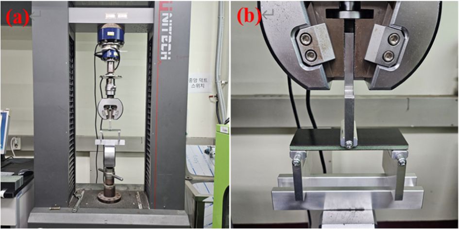 In compliance with ASTM C393/C393M guidelines, the loading rate was selected such that specimen failure would occur within a target duration of 3–6 minutes. Accordingly, a constant crosshead displacement rate of 6 mm/min was applied, resulting in fracture times of approximately 4–5 minutes for all specimens, thereby satisfying the standard requirements. During each test, load and displacement data were continuously recorded. Fig. 2 presents the experimental setup for the three-point bending test, where Fig. 2(a) shows an overall view of the testing configuration mounted on the universal testing machine, and Fig. 2(b) provides a detailed view of the loading nose and support fixture in contact with the specimen.