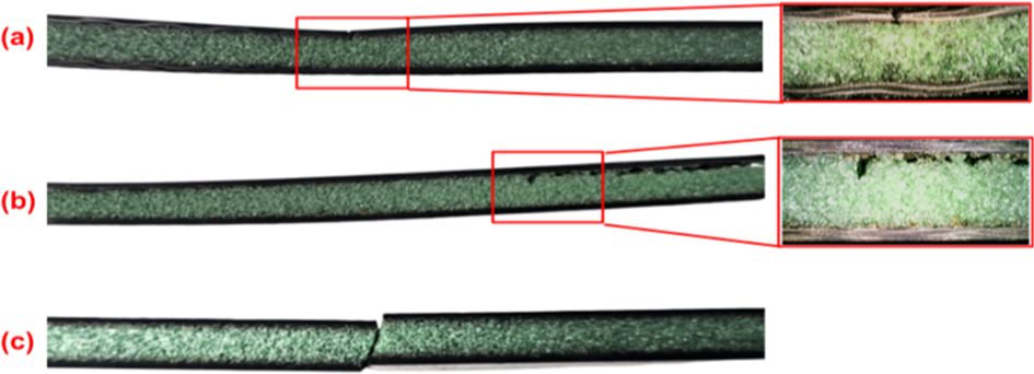 To further validate this interpretation, additional bending tests were conducted using the same UD material with a 0° fiber orientation. In this case, the measured flexural strength was significantly reduced to 27.21 MPa, and a mixed-mode failure involving simultaneous fracture of both the face sheet and the core was observed.