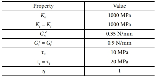 Since the ASTM C297 flatwise tensile test provides interfacial properties primarily under Mode-I–dominant loading conditions, the mixed-mode cohesive parameters employed in this study were not identified as intrinsic Mode-II fracture properties. The tangential (Mode-II) cohesive strength and fracture energy were assigned based on commonly adopted assumptions and representative literature values for polymer-based composite interfaces, solely to enable stable numerical simulation under combined normal and shear loading conditions. Therefore, the present cohesive formulation is intended to assess interfacial reliability under tensile loading rather than to extract intrinsic Mode-II or mixed-mode interfacial fracture toughness.